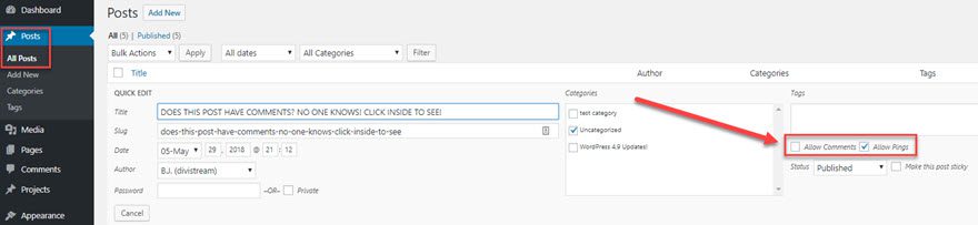如果您想要比“ 討論”頁面所提供的功能更好的控制 ,那麼“ 所有帖子”或“ 所有頁面”菜單將是您的下一站。到達後,點擊“ 快速編輯”並向右看。